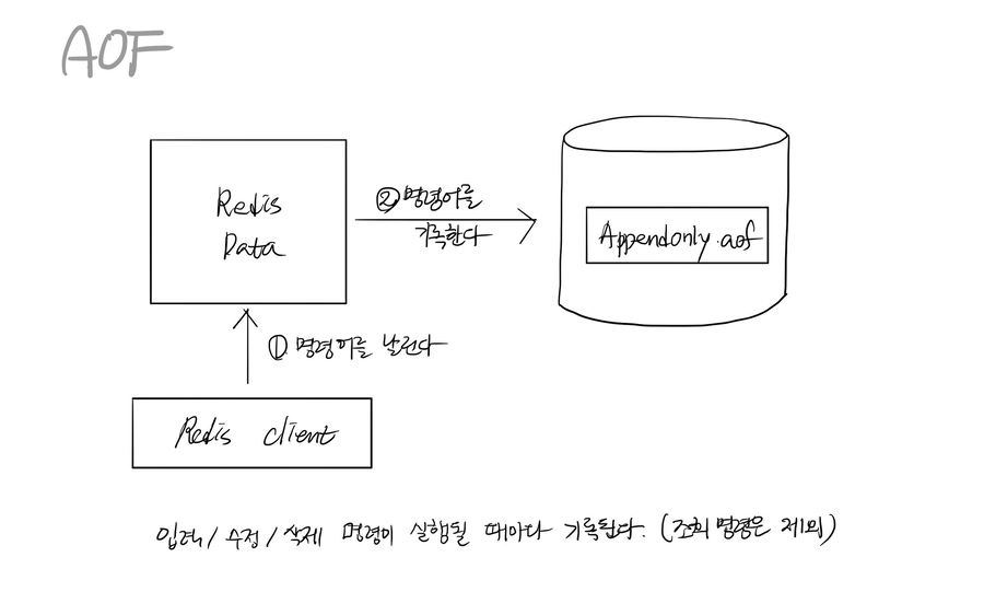 AOF(Append On File) 방식: Redis의 모든 write, update 연산 자체를 log 파일(.aof)에 기록하는 방식