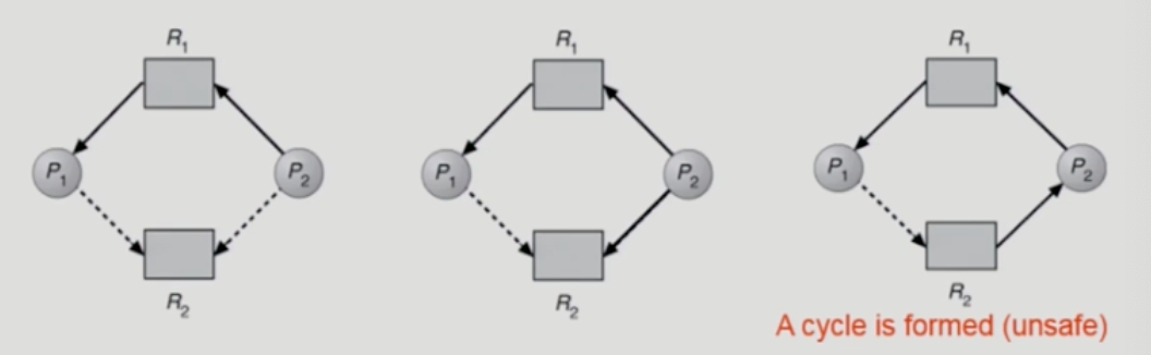 가장 오른쪽 그림을 보면 Cycle이 형성되어있지만 데드락이 발생한건 아니다. 만약 P1이 R2를 요구한다면 점선이 실선으로 바뀌고 데드락이 형성된다. 즉, P1에게 자원 R2를 할당해주면 시스템이 unsafe한 상태가 되므로 할당해주지 않는다.