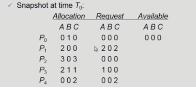 현재 시스템 내 가용 자원(Available)이 (0,0,0)이지만 프로세스들이 보유하고 있는 자원(Allocation)이 언젠가 반환될 것이라고 판단하기 때문에 데드락이라고 판단하지 않는다.