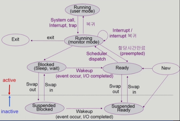 Running: CPU 점유권을 가지고 명령을 수행중인 상태Ready: 메모리에 적재되어 바로 명령을 수행할 수 있는 조건을 만족하는 상태(Ready Queue에 대기중)Blocked(Wait, Sleep): CPU를 할당받더라도 당장 명령을 수행하지 못하는 상태 (IO 작업처럼 요청한 이벤트가 바로 수행 결과를 반환하지 않아 다음 명령을 수행하지 못하는 상태)Suspened(Stopped): 외부적인 이유로 중기 스케쥴러에 의해 메모리를 빼앗겨 수행이 정지된 상태 (디스크로 swap out된다)New: 프로세스가 생성중인 상태Terminated: 프로세스의 수행이 완료된 상태