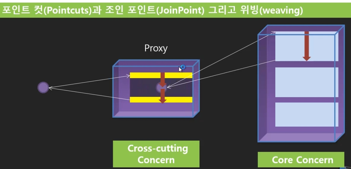 Weaving: Aspect와 대상이 되는 핵심 코드를 연결하는 프로세스. 즉, Advice(공통코드)를 핵심로직코드에 삽입하는 것